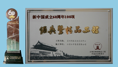 2009年10月29日,由中国建筑业协会联合11家行业协会共同举办的新中国成立60周年“百项经典暨精品工程”评选结果发布颁奖大会在北京人民大会堂召开,经网民投票和专家委员会评审,天安门广场建筑群等100项工程入选,江苏江中集团总承包施工的苏州科技文化艺术中心榜上有名。这是我集团继去年荣获鲁班奖、国优奖后获得的又一殊荣。