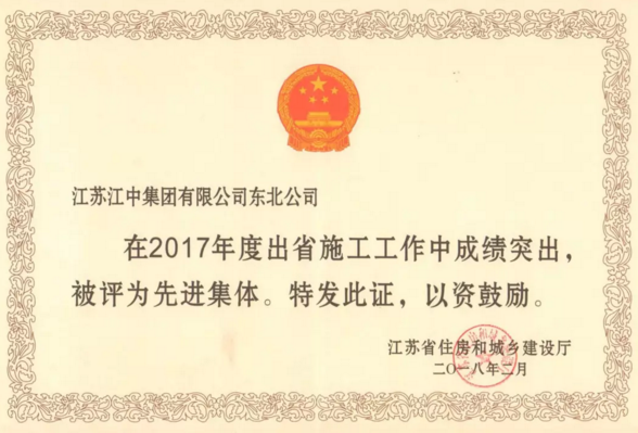 【聚焦江中】集团东北公司荣获“2017年度江苏省出省施工先进集体”