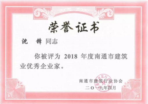 江苏江中集团荣获南通建筑业竞争力三十强企业称号;集团总裁沈锋荣获2018年度南通市建筑业优秀企业家称号并当选南通建筑业协会副会长。