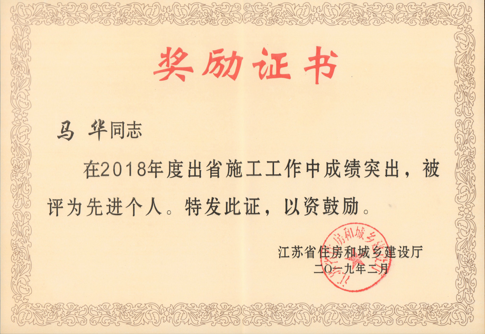 东北公司荣获了“2018年江苏省出省施工先进集体”称号。马华、沈克慧等三名同志被评为“2018年江苏省出省施工先进个人” 称号。