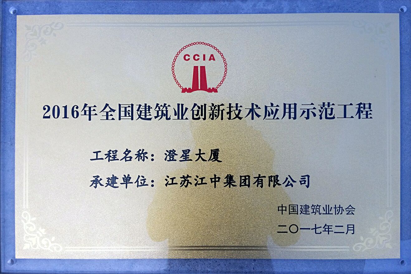 2016年全国建筑业创新技术应用示范工程获奖证书